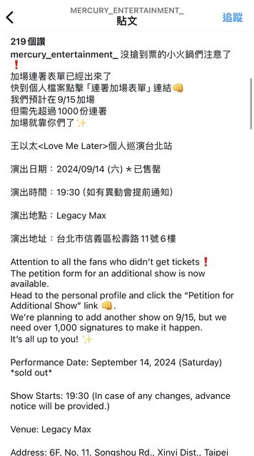剛看主辦方IG說有可能加場但連署要破千