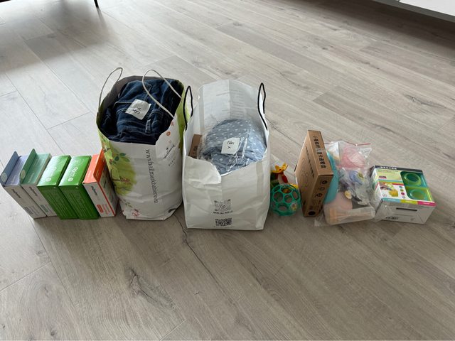 物品項目:孕婦牛仔褲、衣物、嬰兒用品、母乳袋。