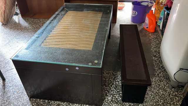 位孫子的回憶。椅凳可以塞回去茶几下面收納。茶几上面的灰塵清潔乾淨就可以了,因為