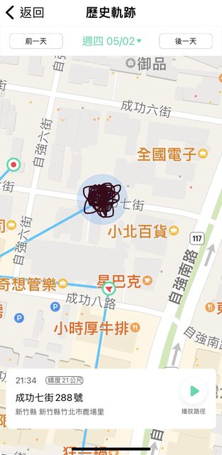 遺失時間:最後定位的時間是在5/2號,21:34 竹北成功七街這邊