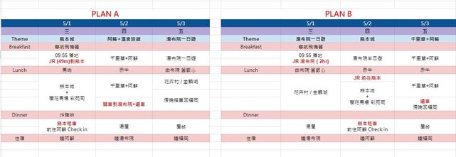主要想玩的點有熊本、阿蘇、湯布院、福岡,我們安排 2 條路線想問問看大家的意見: