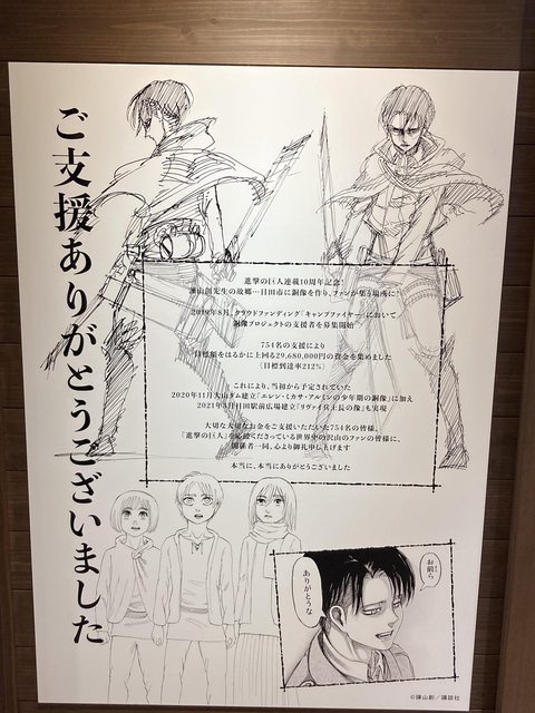 主角三人組小時候的銅像,設計概念是在第一話看到超大型巨人破牆的場景