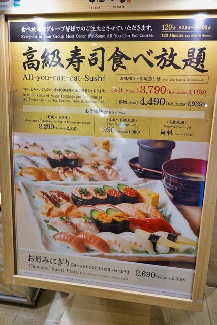 晚餐是吃雛鮨壽司吃到飽(新宿マルイアネックス店) 可以先上網預約 我們點單純壽司吃到飽沒點喝的 男生是1人4,939円(含稅) 女生是1人4,169円(含稅) 每桌1次最多點20顆