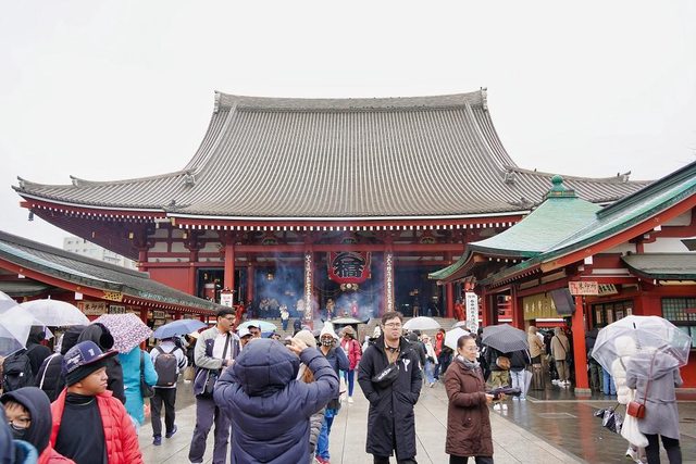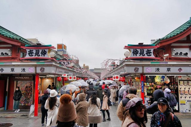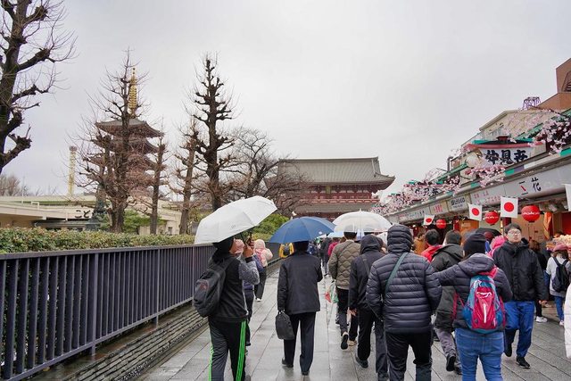 淺草寺自628年開山至今 仲見世通也是日本最古老的商店街之一 還不到10點也是很多人 主要也是因為很多人撐傘所以顯得更擁擠 店家大約開一半