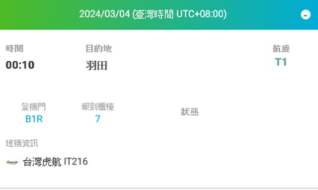 → TIPPK : 3月1號虎航成田飛桃園是預計晚上9點50到。結果到的 03/03 23:03