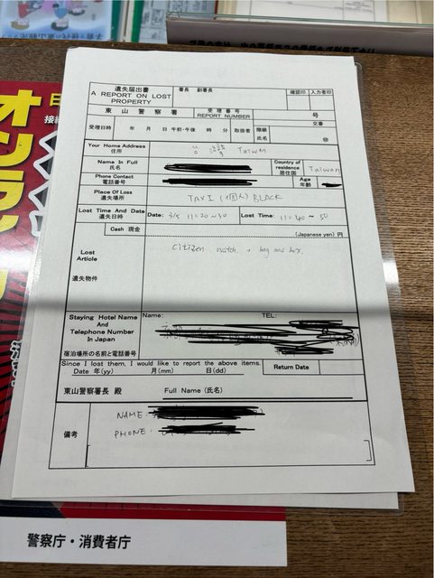 警察拿了遺失物表格要我們填寫