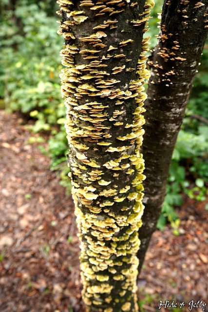 我們來整理一下:從停車場進入玄蕃尾城登山道要爬25分鐘b城內各區域逛了50分鐘再花15分鐘下山剛好所要時間1.5小時。回程時看到一顆被木耳類爬滿的樹木,看了