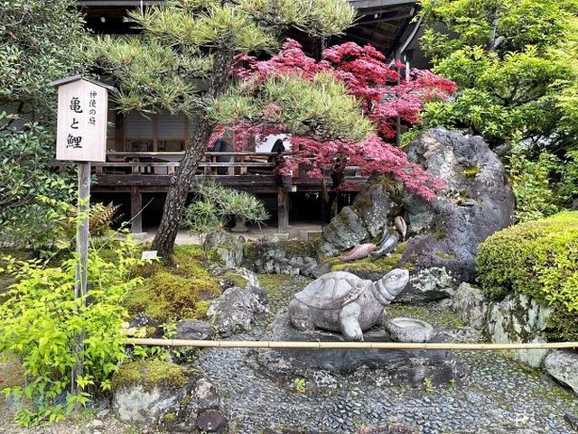 「社務所」前的鯉魚與烏龜的雕像。據說「大山咋神」來到松尾時,是沿著桂川而上的。