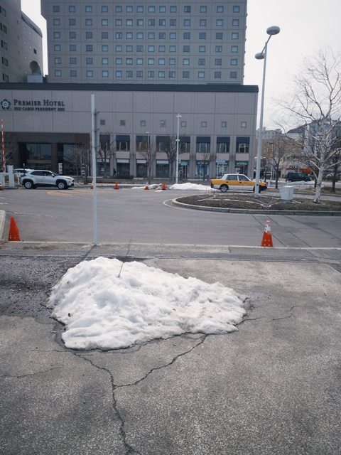 3月底是個沒雪也沒櫻花的季節,路上只有待融的冰堆