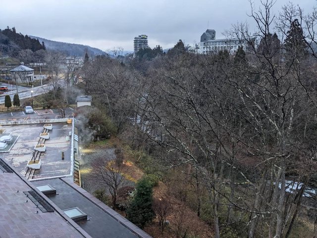 房間窗戶就可以看到溪流景色跟飯店溫泉冒出來的煙