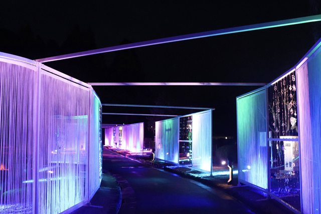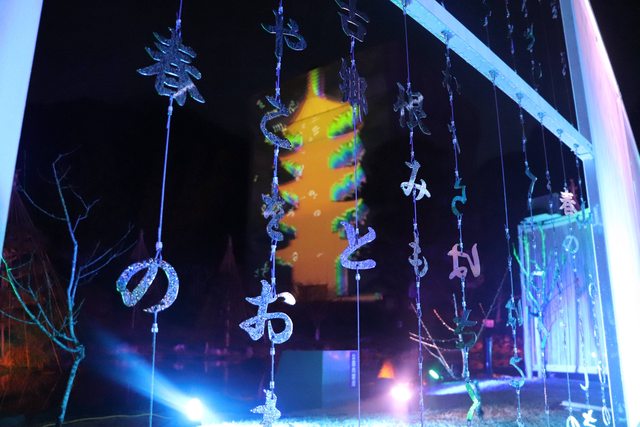 以投影動畫方式呈現構築「西之京・山口」的大內氏一族之歷史、文化思想。另於五重塔前利用彩色玻璃打造「大內文化思想巡禮之道」創意夢幻光藝空間。