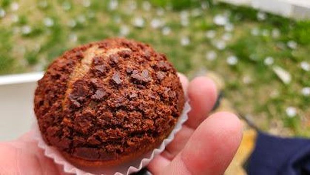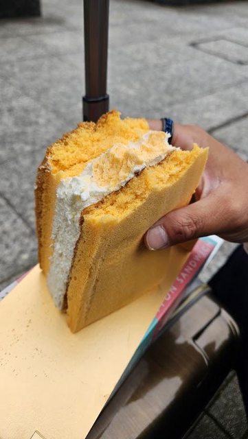 買了一個蛋糕,這蛋糕真好吃,但我到了公園打開才知道沒有餐具,只能當個野蠻人,