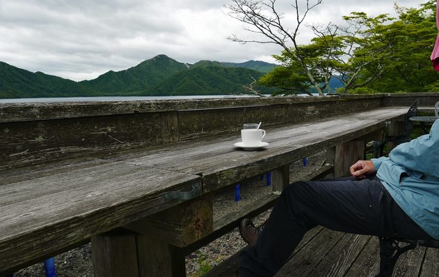 拿著咖啡去外面平台,看湖景跟山景放空,