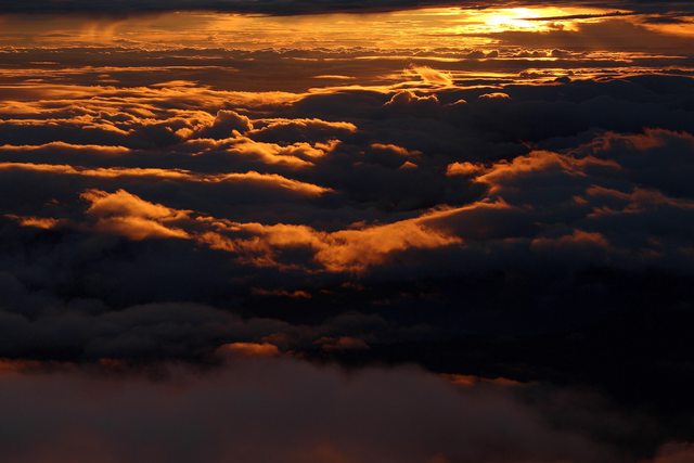 富士山山頂的御來光 , 幾百公里遠的雲層被日出染成一片金黃 ~