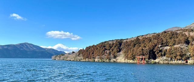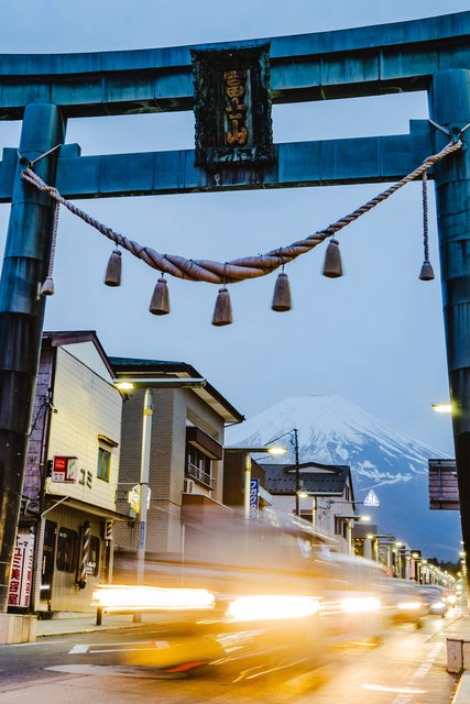 這處也是較少人推薦的點「金鳥居」,在路口巨大的鳥居剛好框住富士山,當時已經接近