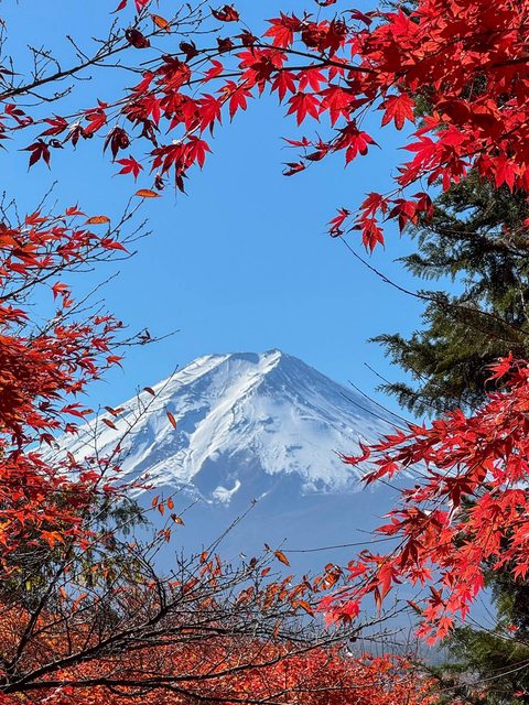 也因為這樣才可以慢慢的調好角度拍照,剛好11月底楓葉還是正紅,這張以富士山為主體