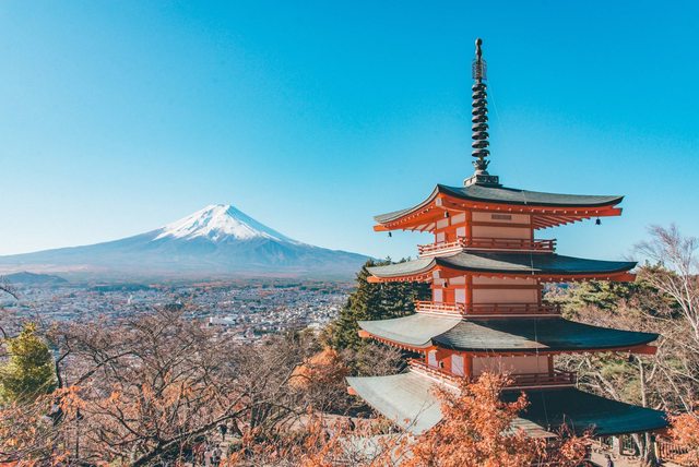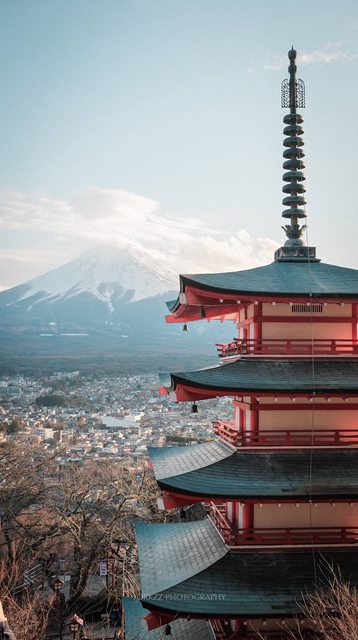 鮮紅的忠靈塔,映襯著遠方的藍天富士,隨著400階的石階拾階而上,讓煩惱遺留在山腳