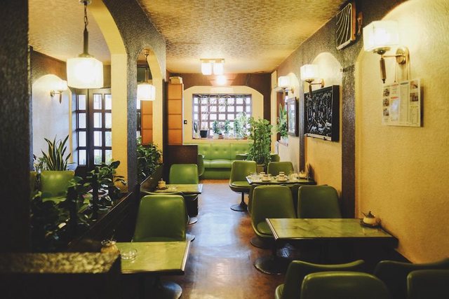 # 喫茶セブン店內環境空間,綠色基底暖色調座席