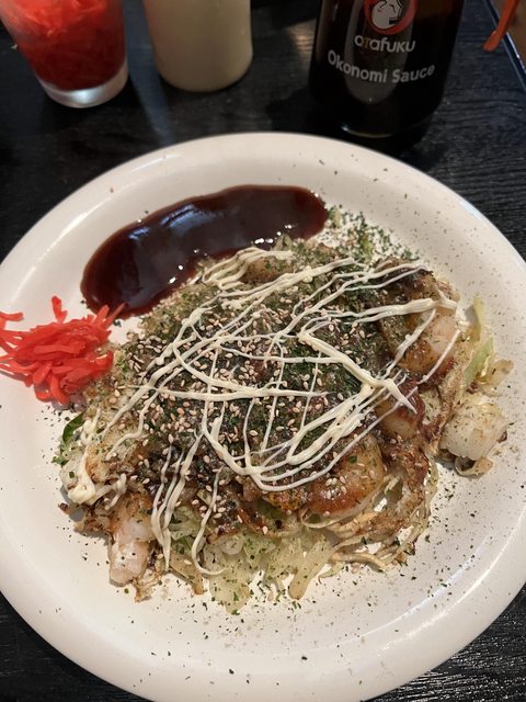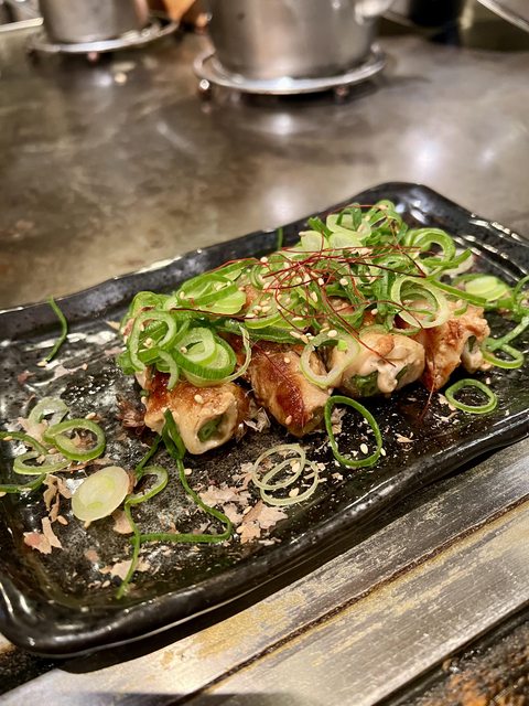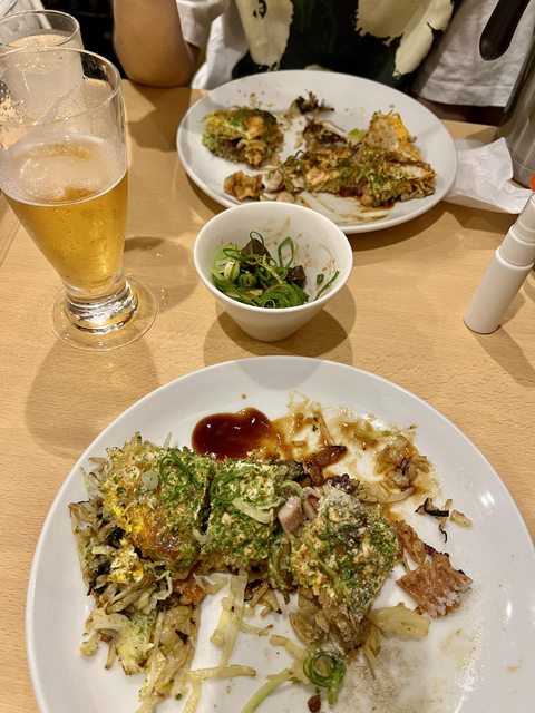 點了玉米鮪魚起司廣島燒、肉包秋葵、生啤,