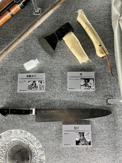 像是常用的氰酸鉀、菜刀、(斷掉的) 斧頭、(敲凹的) 棒球棍、假髮,