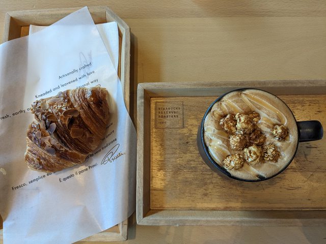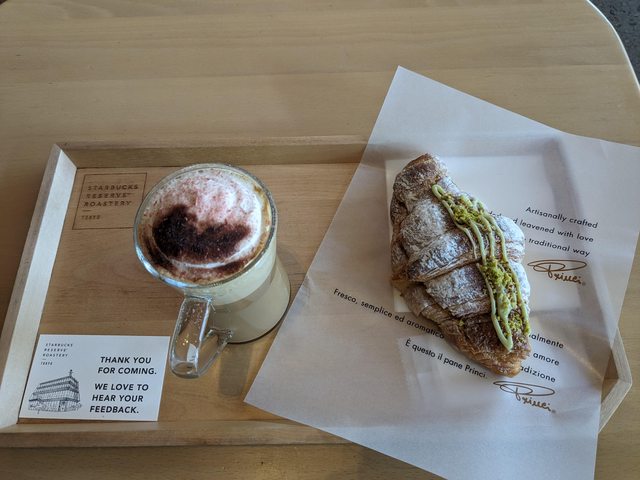 奶油拿鐵與開心果可頌。Princi的可頌很好吃,即使有夾心也不會太甜。