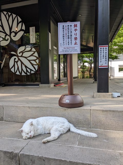 在院區也看到一隻全身純白的貓,動也不動地在睡覺。原來是寺廟養的貓,
