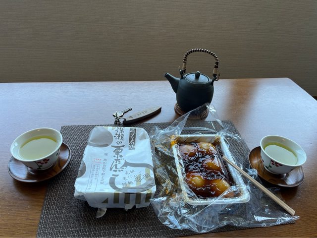 回房間再享用昨晚在飯店訂購的甜點-深瀨の栗(5粒裝、850円),早上去櫃台領取,摸 起來還熱熱的。這家是傳承三代的日式點心店,每顆糰子包著整顆栗子、泡在混合糖及醬 油的濃稠醬汁中,吃起來很滿足。