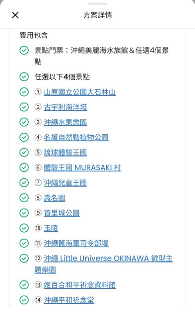 門票包含美麗海水族館門票,與其他景點任選四個,可以選擇的景點如下圖。