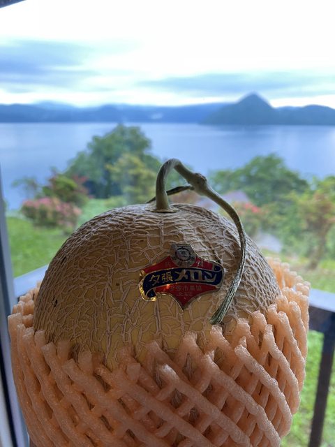 半顆哈密瓜直接挖著吃,配上超商買的冰淇淋和登別買的布丁 爽!