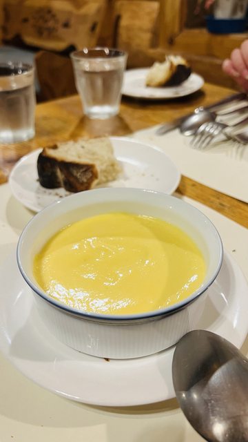 濃到不像湯,幾乎是醬料的濃度,用外酥內軟的麵包沾著吃一大片馬上就吃完了。