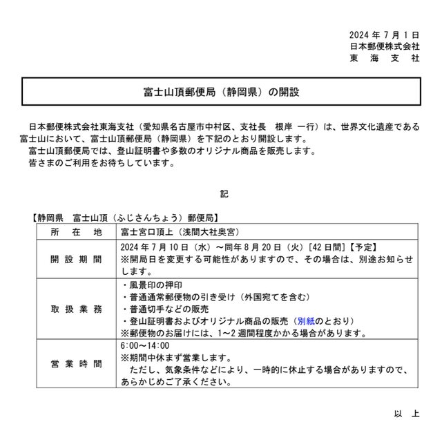 標題[資訊] 2024富士山頂郵便局開設日7/10~8/20