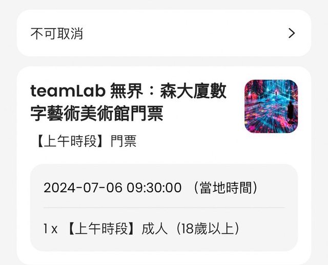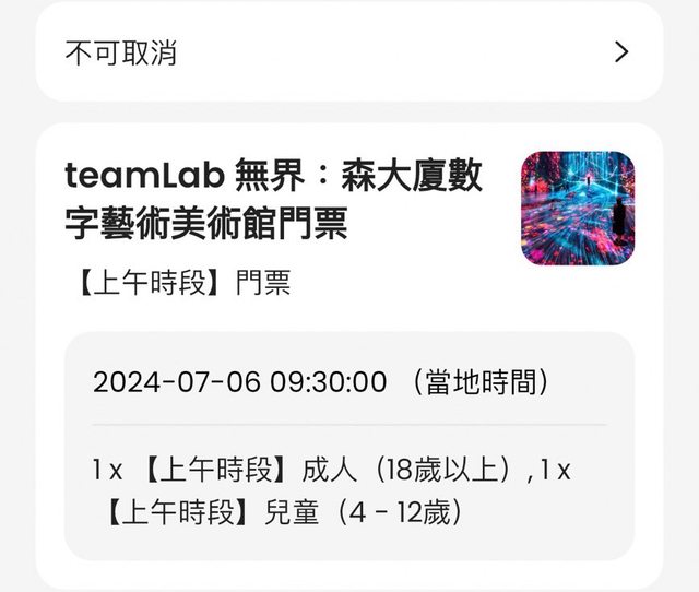1. 讓售品項:7/6 teamLab無界:森大廈數字藝術美術館門票,兩大一小,0930入場。