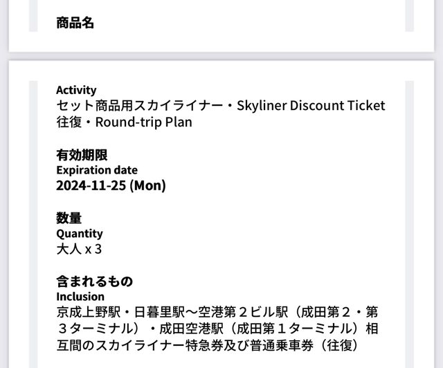 Skyliner 往返到期日2024/11/25