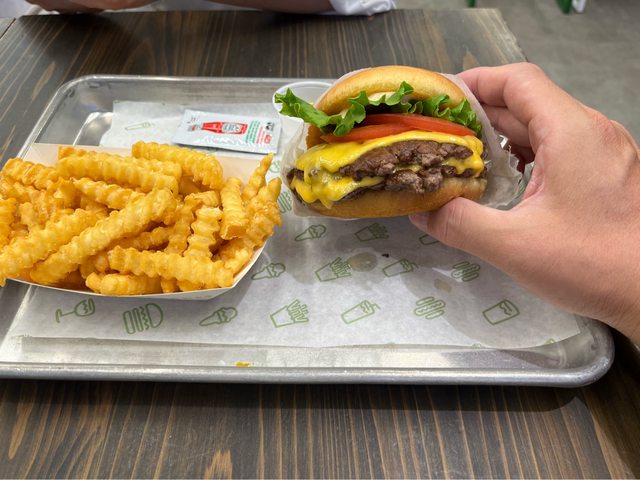 除了購物外,原本想在這吃靜岡炭烤漢堡排さわやか,但是爆滿中、已停止取號。改吃號 稱紐約最好吃的漢堡-Shake shack,選了雙層100%安格斯牛肉搭配起司、番茄及生菜的漢 堡吃起來美味多汁,不過價格略高(漢堡+薯條1,980円)。