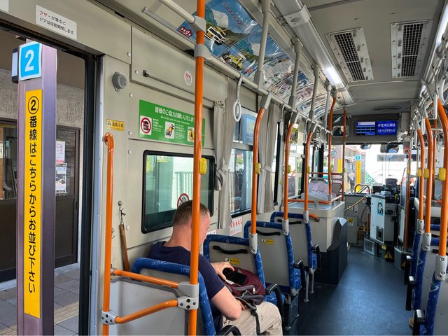 在餅乾店前方搭公車回河口湖駅(紅線、180円)。