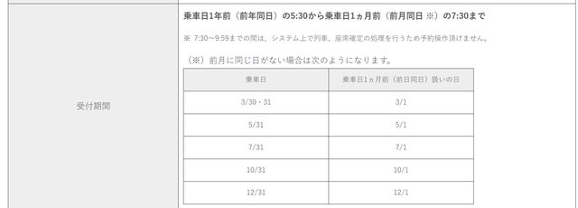 1.開放乗車日為1年前(前年同日)の5:30から乗車日1ヵ月前(前月同日 ※)の