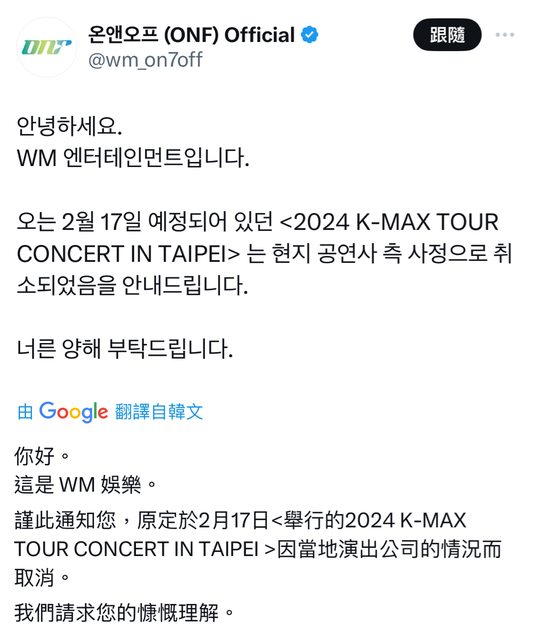 → nccucat: 為什麼ONF的官推取消公告一直刪掉重發? 111.83.99.254 02/04 14:20