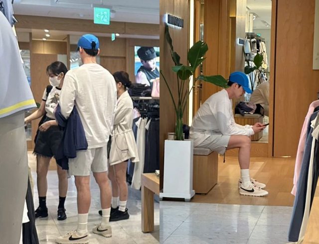 旁高挑的金宇彬引人注目,金宇彬陪在旁邊陪著女友挑衣服,之後走到一旁的椅子坐下邊