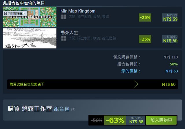 https://store.steampowered.com/app/1360670/ 這款好像有趣 79->59 25%off 要買的注意一下,買組包更便宜,還多送一套遊戲 https://i.imgur.com/bXZavpD.png
