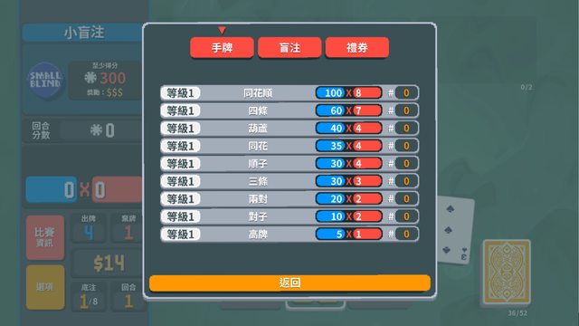分數計算是由 出牌點數+牌型基礎分數x牌行倍率 只要能達到目標分數就算過關