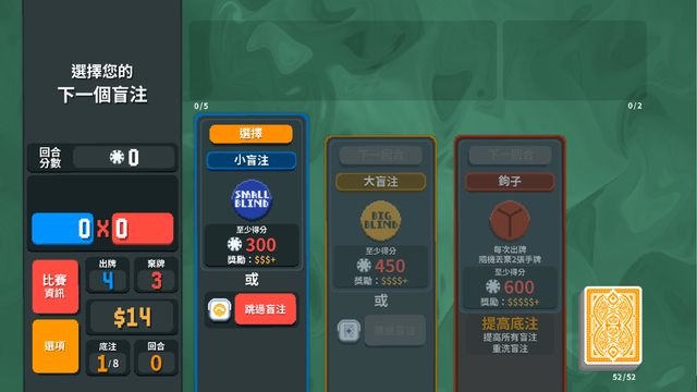 或者也能跳過大小盲注換取特殊加成 比如像是下一回合勝利後商店免費、直接拿卡包等
