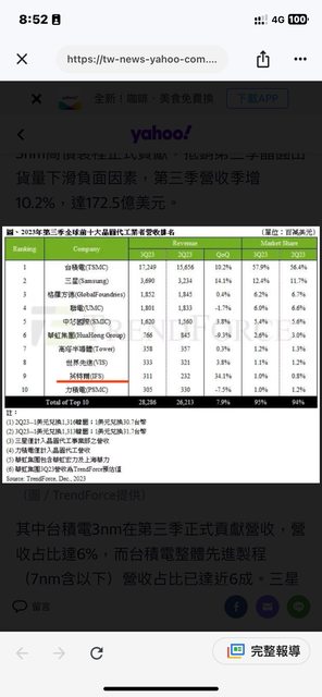 出貨,營收季增3.8%,達3.3億美元,排名首度超越力積電(PSMC),上升至第八名。IFS則