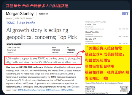 推 kids2224 : 美國投資人將台積視為AI發展的關鍵企業.大摩學哲哲 03/11 09:28