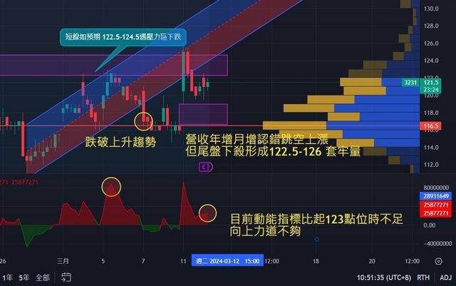 給短線跟單持有的夥伴,在3/2發文後也有老老實實的漲上122.5~124.5壓力區,有出掉