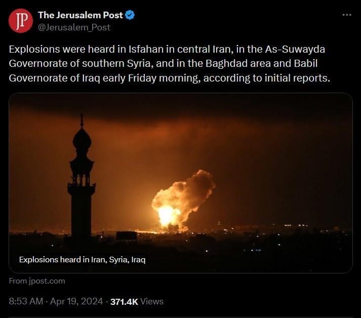 → Crushredkiss: 週五早晨,伊朗突發爆炸,美國稱以色列打擊伊朗設施 04/19 15:11