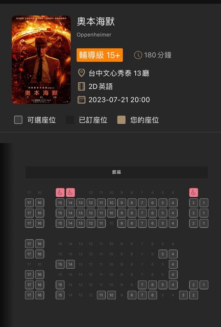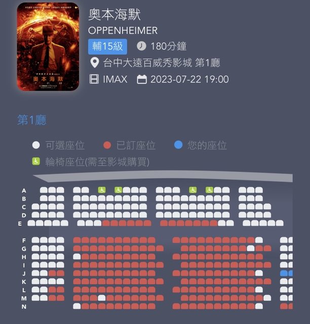 今天又心血來潮想訂票(我知道我太晚訂了) 果難諾蘭不虧是諾蘭 imax熱門時段好位置幾乎都沒了 https://i.imgur.com/QFDjDK1.jpg