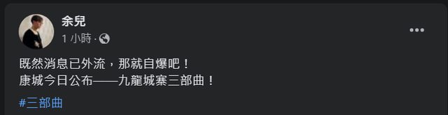 《九龍城寨》原著小說作者余兒於個人社交平台證實消息,並表明將為三部曲