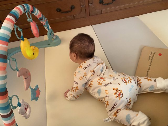 推薦買健力架,能吸引寶寶翻身趴臥,之後爬行跟練習坐著也都有派上用場。