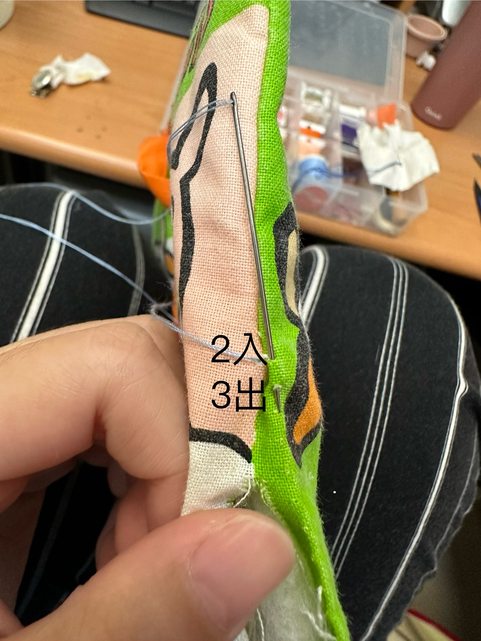 第二針 從對面的布進去 第三針從跟第二針下方出來(可以跟著布書原本縫的位置下針,通常會有個小孔很好認)