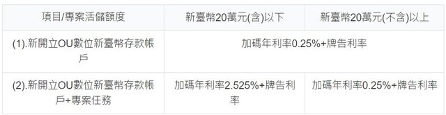 範例:客戶小光2023/04/06前不曾持有新光銀行任一帳戶於2023/04/10首次成功開立OU數 位新台幣存款帳戶並於2023/04/20前完成專案任務,故自2023/5/1~2023/10/31享有加碼 年利率2.525%。 付息方式: (一) OU數位新臺幣存款帳戶年利率同新光銀行牌告利率-新臺幣活期儲蓄存款牌告利率, 利息依新光銀行現行作業方式於每年6月、12月付息。 (二) OU數位新臺幣存款帳戶活儲 加碼利息每月依專案條件計算加碼利息,於起息月之次月十日(遇例假日提前至前一營業 日)給付前一月專案活儲加碼利息。 (三) 完成任務期間開立OU數位新臺幣存款帳戶並完 成專案任務,於完成專案任務之次月1日起,逐日以OU數位新臺幣存款帳戶日終餘額計算 加碼利息。 (四) 每一存款帳戶於加碼年利率2.525%之每月「專案活儲額度」上限為新臺 幣20萬元。 -- ※ 發信站: 批踢踢實業坊(ptt-website.tw), 來自: 45.144.227.14 (臺灣) ※ 文章網址: https://ptt-website.tw/Bank_Service/M.1680765277.A.220
